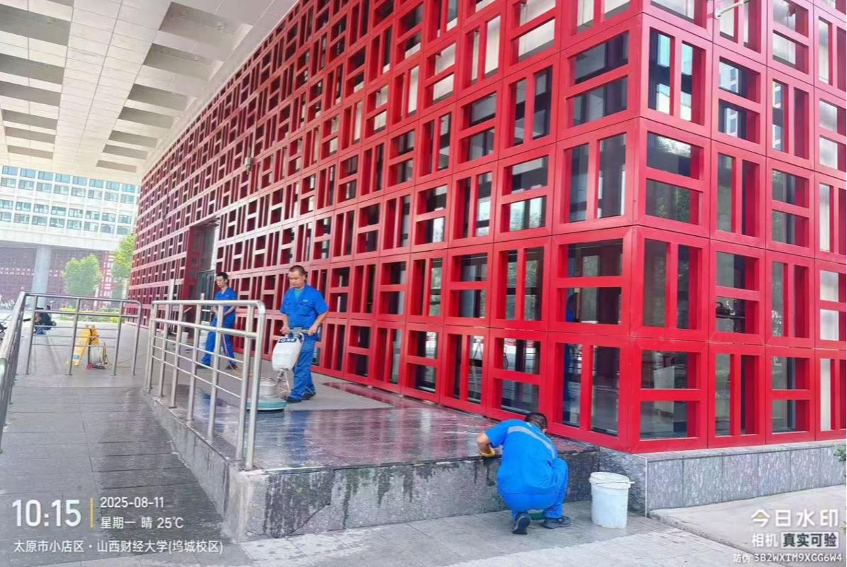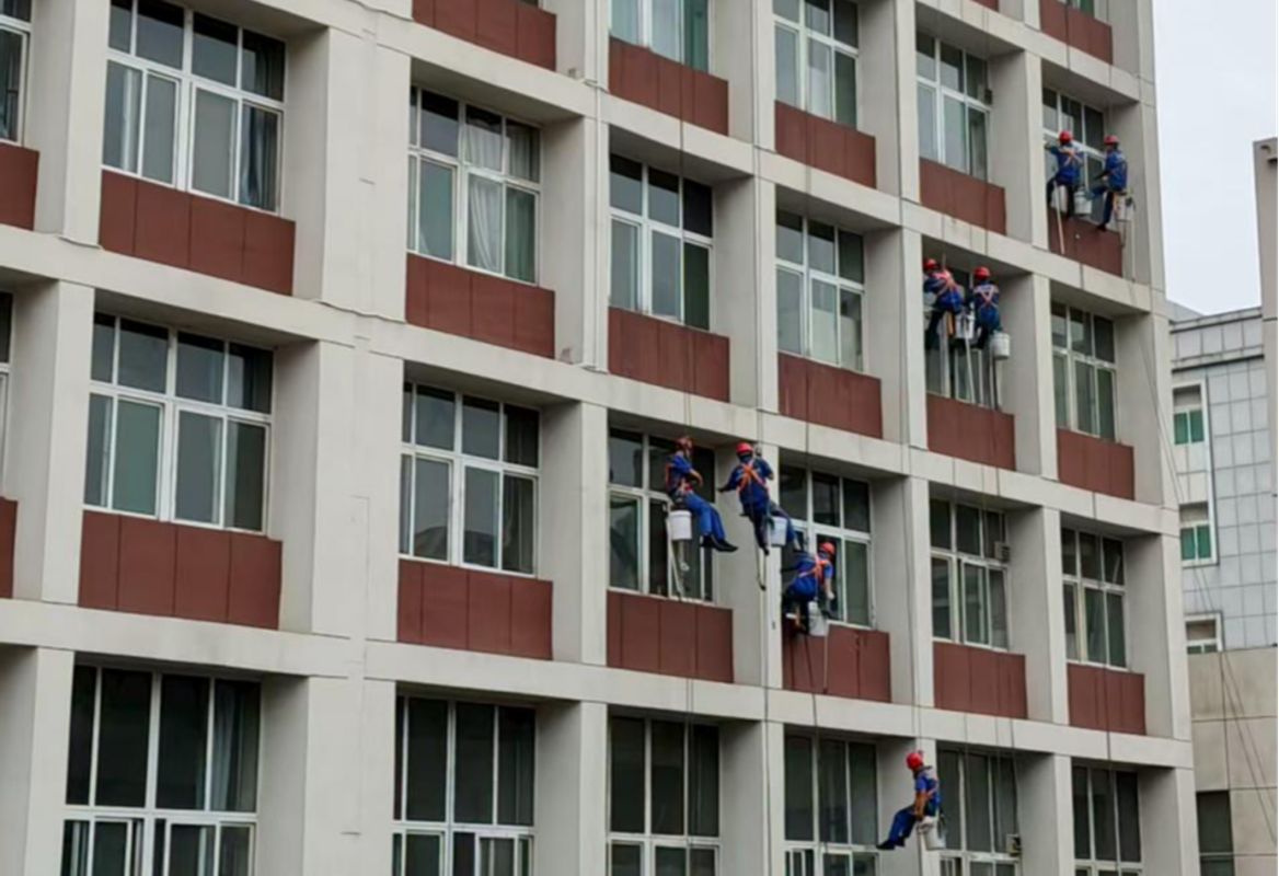 细节品质提升:后勤管理部协调蓝泰物业组织“蜘蛛人”对修德楼、科学楼外墙门窗玻璃进行专业高空清洗作业,工人师傅们头顶烈日,悬浮高空,用他们的汗水和勇敢换来去尘后的玻璃在阳光下格外透亮,整栋楼宇焕发出崭新活力。此外,蓝泰物业忙碌一假期完成了宿舍设施检修、过街天桥路面修缮、校园水箱水池清洗及水质检测等工作,全方位保障校园运行“无死角”。