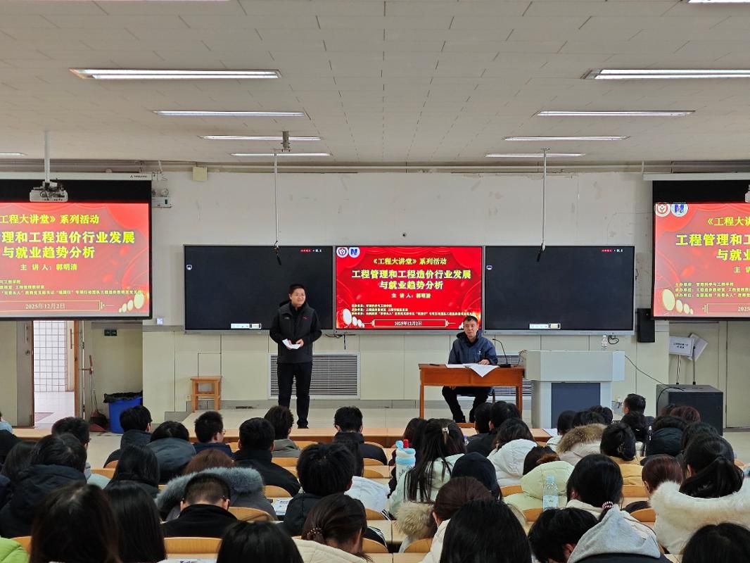 为让本科生了解工程前沿、激发专业热情、提高职业素养,培养工匠精神,12月2日下午,管理科学与工程学院在立信102阶教组织了《工程大讲堂》第十八期活动。本次活动以“工程管理和工程造价行业发展与就业趋势分析”为题,邀请山西省建设工程造价管理协会党支部副书记、太原市仲裁委员会仲裁员郭明清做主题报告。2023级和2024级工程造价、工程管理、房地产开发与管理专业的150余名学生和部分专业教师参加活动。本次活动由工程造价教研室和工程管理教研室承办、全国高校“双带头人”教师党支部书记“强国行”专项行动团队工程造价教研室党支部协办,学院副院长荆树伟主持。