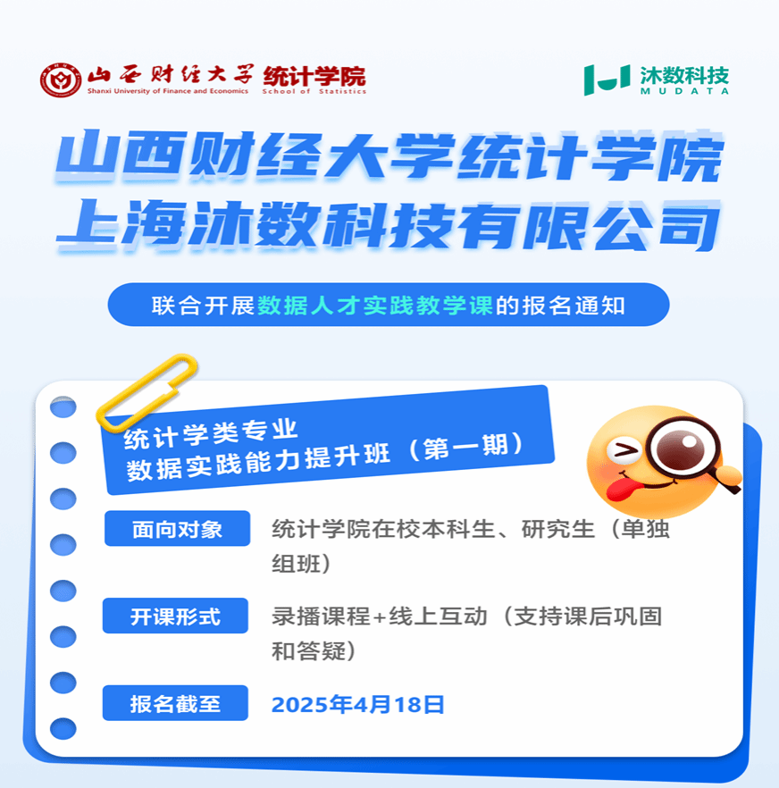 双方以强化统计学类专业学生的数据实践能力为目标,开发以实践应用为导向的课程,聚焦数据治理,可视化设计,指标文档梳理,产品说明文档撰写,SQL应用,数仓建模及可视化开发全流程,通过"理论+实操+项目实战"模式,助力学生掌握统计工具的实际应用,提升就业与科研竞争力。第一期面向以就业为导向的在校本科生和研究生,导师团队由专业导师和行业导师组成,第一期专业导师由统计学院数据科学系主任李原教授和统计学院数据科学系党支部书记张晓琴教授担任,上海沐数科技有限责任公司创始人兼CEO胡赠华、上海沐数科技太原分公司总经理贺佳楠为行业导师对接人。4月18日,双方联合开展统计学类专业数据实践能力提升班(第一期)报名,共有45名同学参加报名。