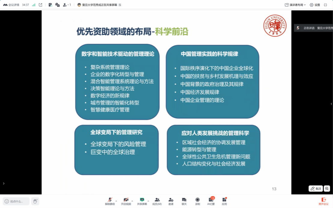 12月11日晚上,复旦大学管理学院范秀成教授应邀在线上腾讯会议平台,围绕“国家自然科学基金项目申请经验”开展了专题分享。论坛由工商管理学院副院长齐永智主持,学院教师与硕博研究生70余人参加。范教授结合自身多年学术积累与评审经验,系统解析了国家自然科学基金的申报策略、评审要点与学科前沿趋势,为与会者提供了一场内容翔实、指导性强的学术交流。