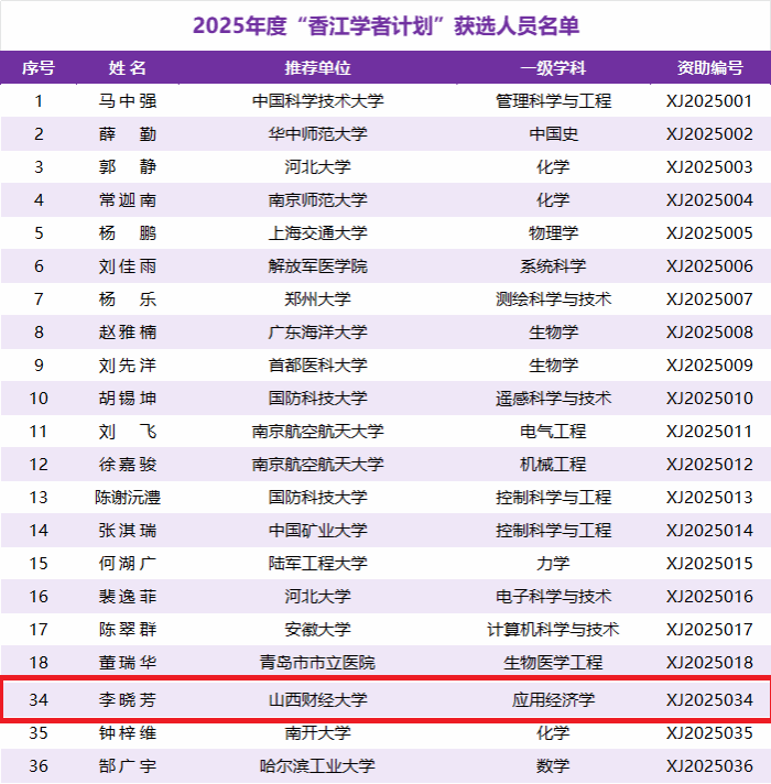 8月29日,全国博士后管委会办公室发布2025年度“香江学者计划”评选结果,我校应用经济学博士后科研流动站博士后李晓芳成功入选。今年,全国共遴选59名青年人才入选该项计划,我校成为山西省唯一入选单位。