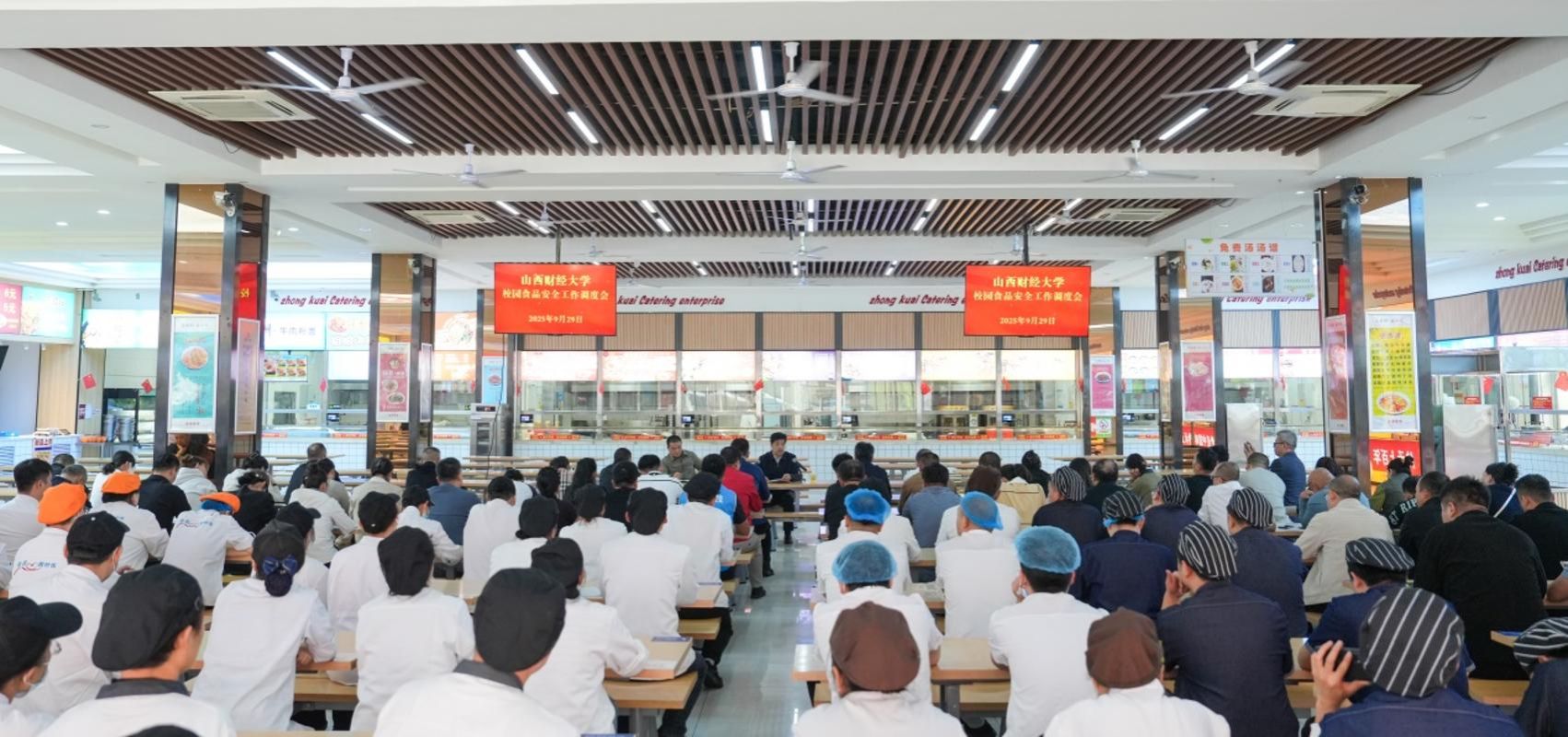 为进一步加强校园食品安全管理,全面提升高质量饮食服务保障水平, 9月29日下午,我校2025年第三次食品安全工作现场调度会在学生三食堂召开。党委常委、副校长李向阳,后勤管理部及博雅学院相关负责人,各饮食物资供应企业、餐饮经营单位、校园商贸单位负责人及食堂从业人员共140余人参加会议。