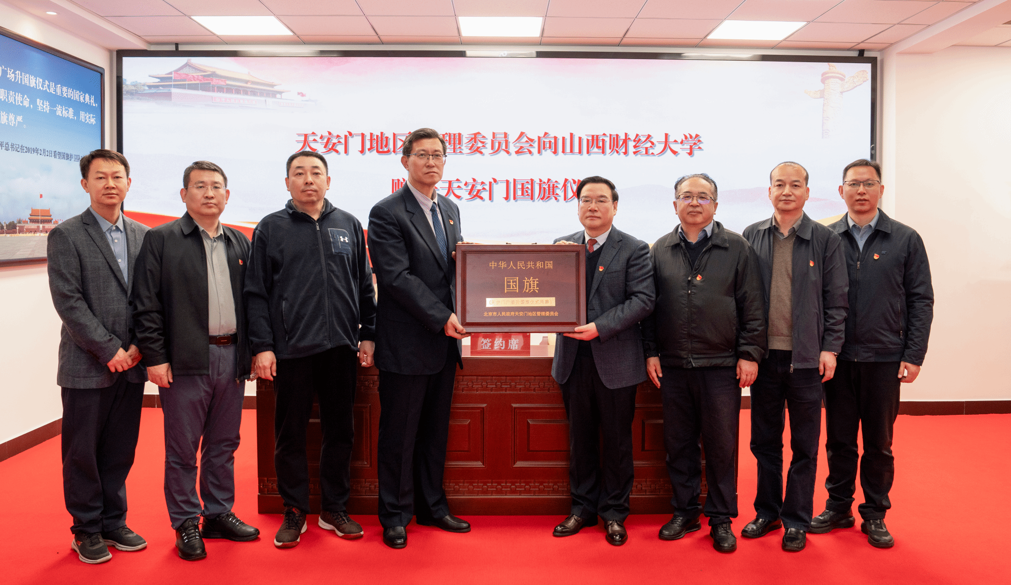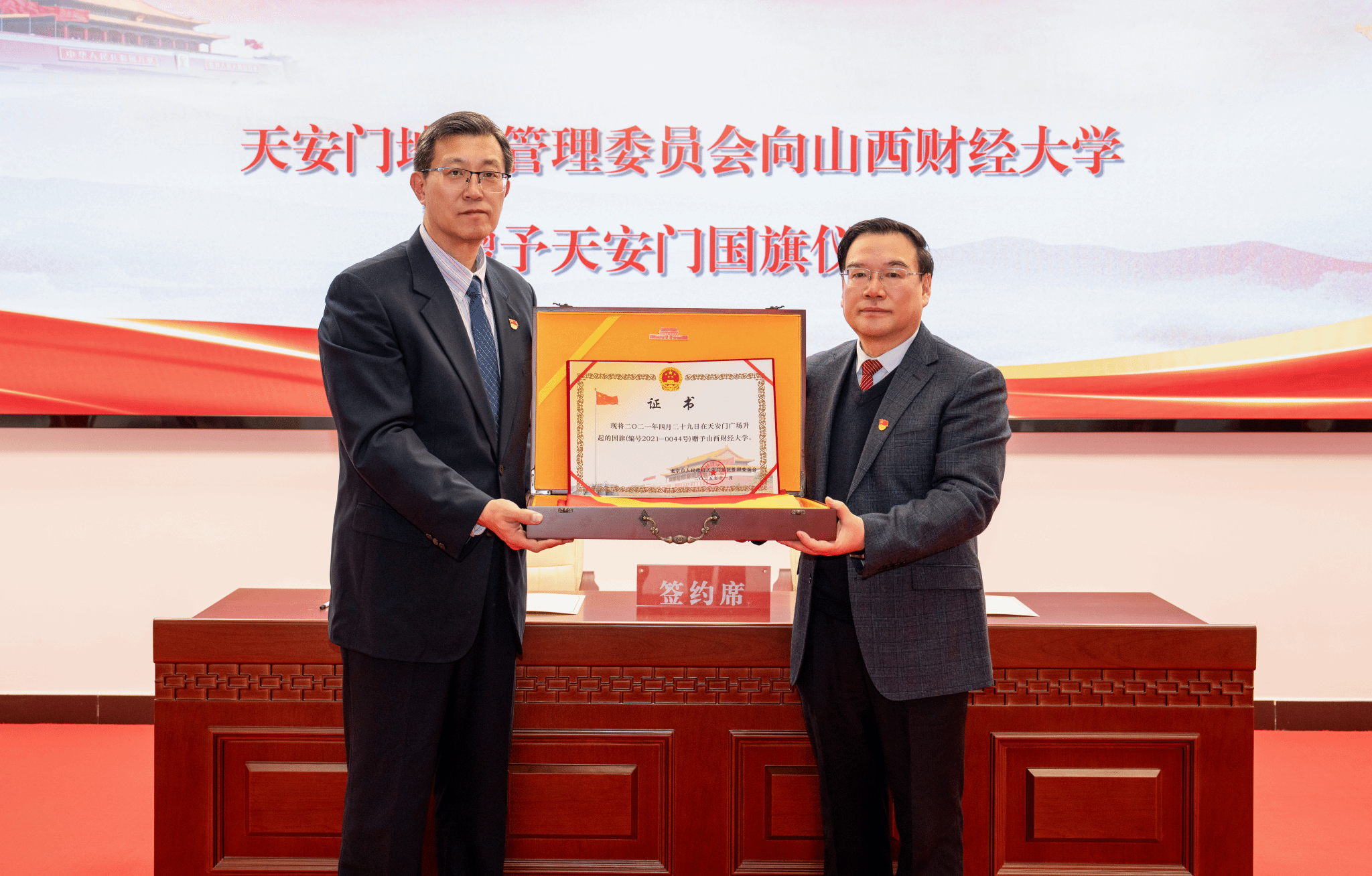11月13日,北京市人民政府天安门地区管理委员会举行赠予天安门国旗仪式。天安门地区管委会党组成员、副主任姚辉(正局长级)向学校赠送国旗,党委书记丁耀武代表学校接收国旗,签订了《国旗赠予协议》。学校党办、校办,学生工作部、武装部相关同志参加赠旗仪式。