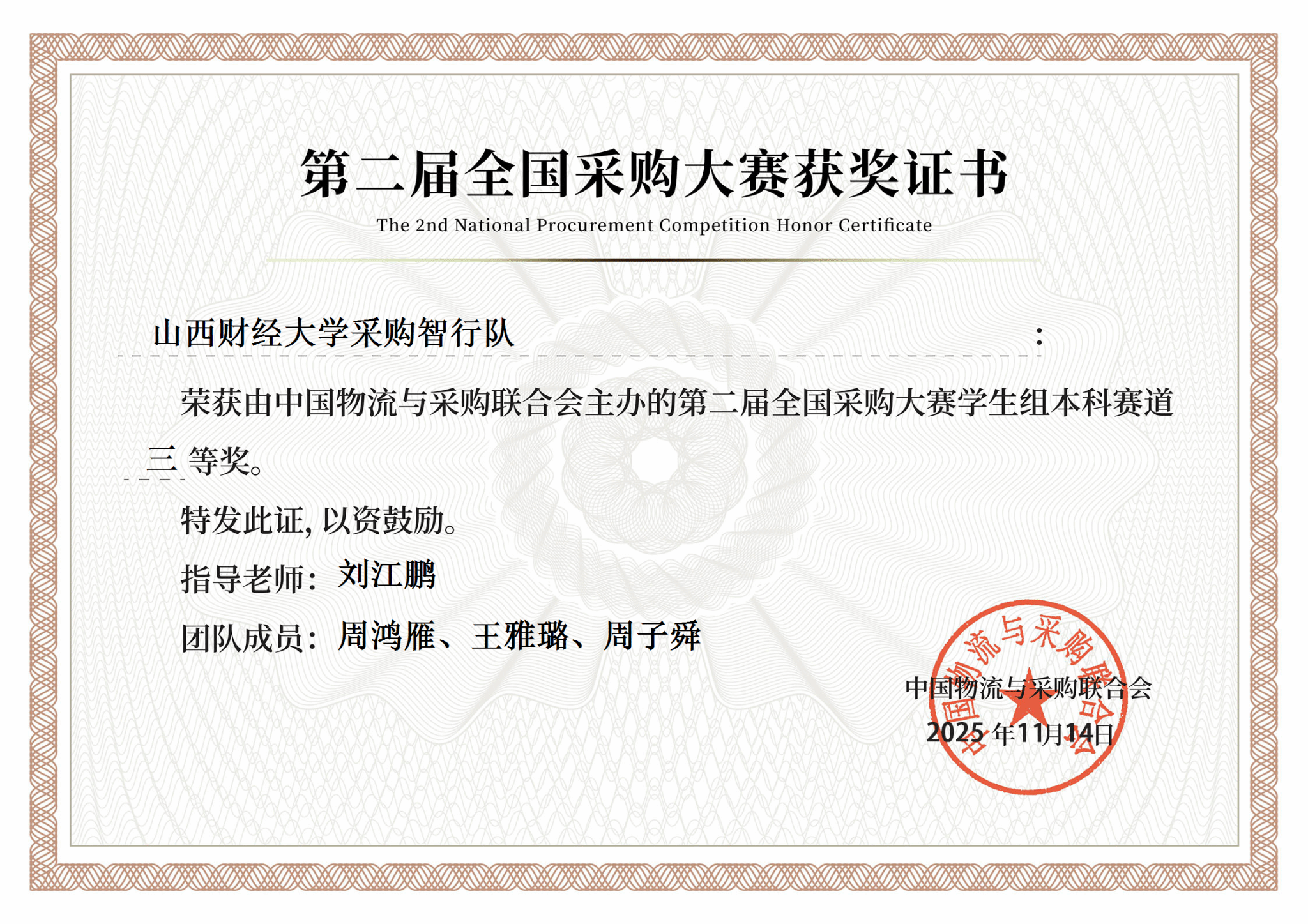 近日,由中国物流与采购联合会主办,北京物资学院、中国石油物资有限公司、中央财经大学联合承办的第二届全国采购大赛决赛圆满收官。本届大赛吸引了全国百余所高校组队参与,120支优秀队伍晋级决赛。工商管理学院物流管理专业周鸿雁、周子舜、王雅璐三位同学组成的“采购智行队”,在全国决赛中脱颖而出,荣获本科赛道全国三等奖。