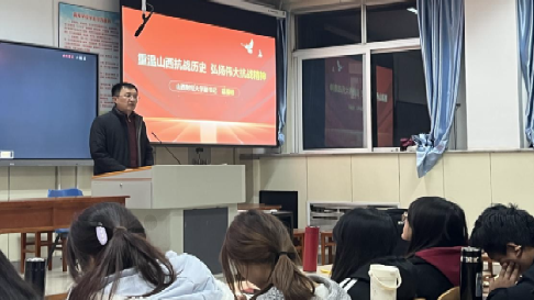 12月25日,党委常委副书记寇福明教授以“重温山西抗战历史弘扬伟大抗战精神”为题,在立信202阶教为2024级计算机科学与技术1班、2班和3班166名本科生带来了一堂兼具历史厚度与思想深度的思想政治理论课,带领青年学子在回望烽火岁月中感悟精神力量,在传承红色基因中明确使命担当。