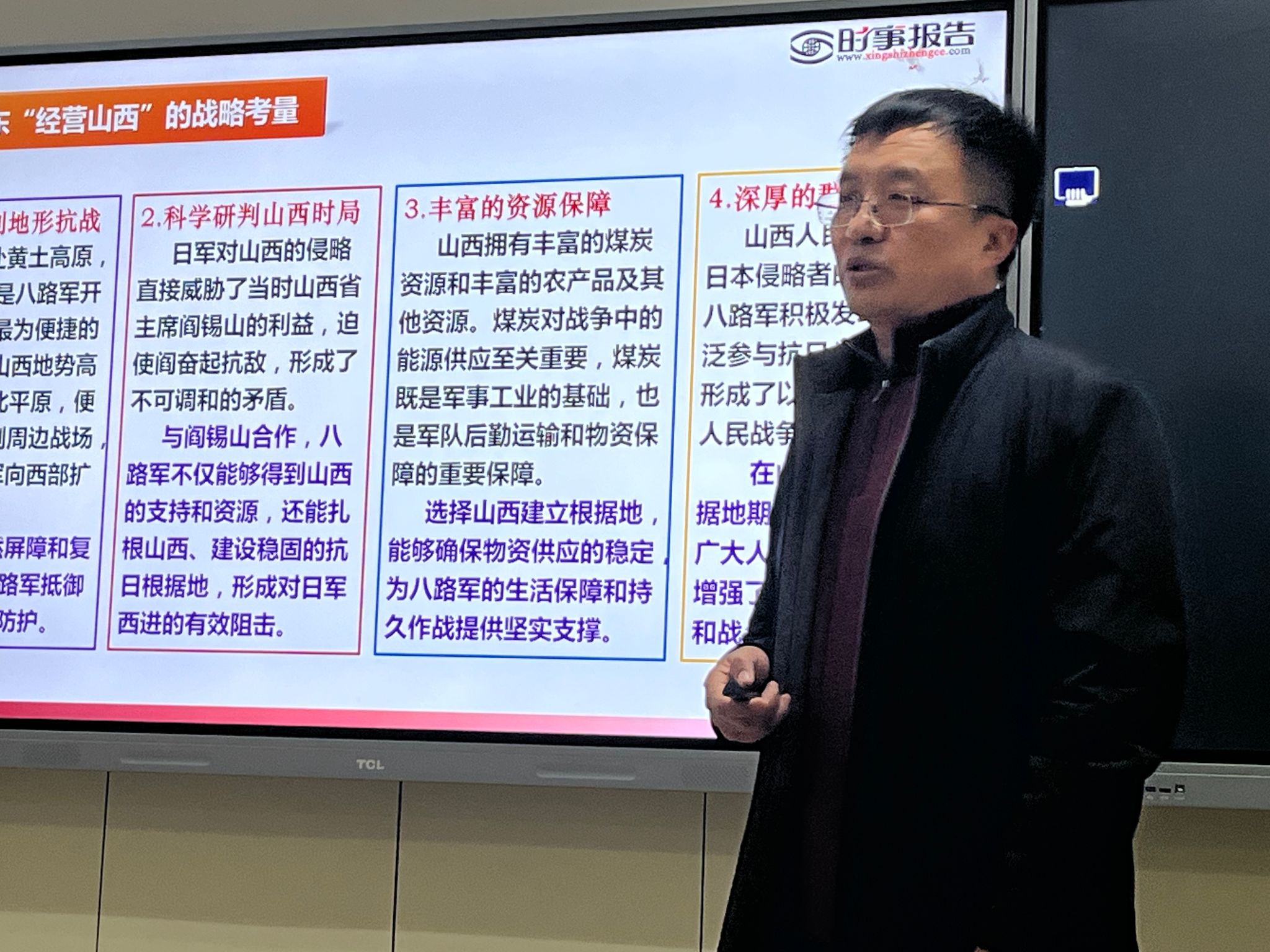 寇福明教授结合丰富的史料与严谨的分析,从地理区位、资源禀赋、战略决策等维度,系统梳理山西抗战的独特价值,生动形象地讲解了山西的军事战略地位、毛泽东决策“经营山西”战略、山西抗日根据地的创建等丰富的历史知识,晋察冀抗日根据地、晋绥抗日根据地、晋冀豫抗日根据地和晋西南抗日根据地等的创建和发展,以及雁门关伏击战和夜袭阳明堡等许许多多感人的英雄人物和故事。他勉励同学们牢记习近平总书记在山西阳泉参观百团大战纪念馆展陈时强调的“要讲好抗战故事,把伟大抗战精神一代代传下去”嘱托。