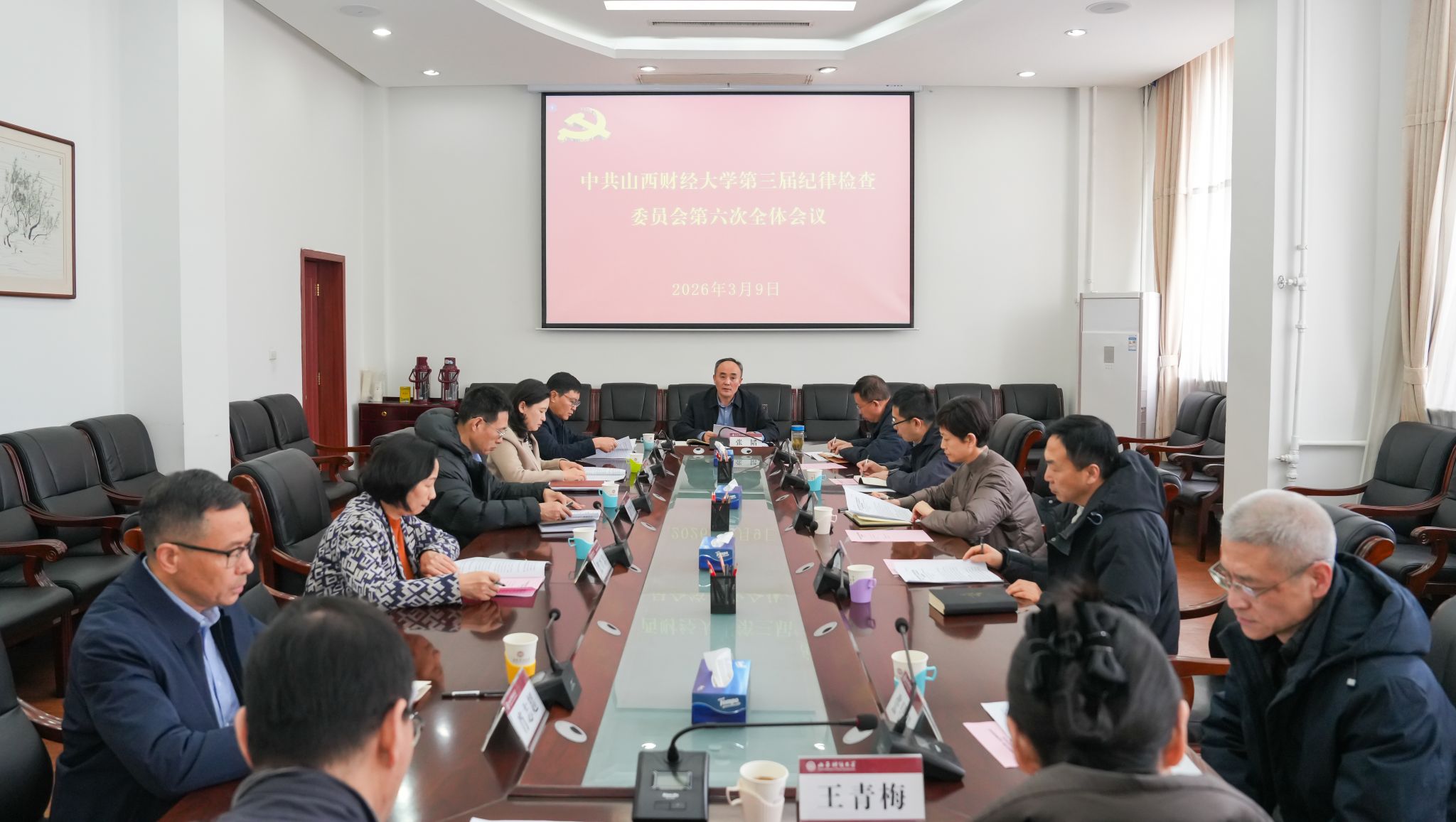 3月9日,中共山西财经大学第三届纪律检查委员会第六次全体会议在修德楼15层1号会议室召开。党委常委、纪委书记、监察专员张韬主持会议并作报告,全体校纪委委员参加会议。
