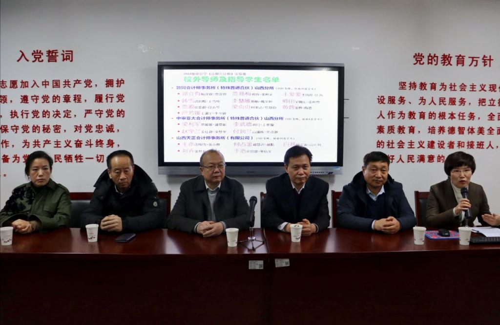 12月1日下午,会计学院于学院会议室隆重举行了2018级审计学(注册会计师)实验班校外导师聘任仪式。山西省注册会计师协会秘书长张志祥、致同会计师事务所管理合伙人李莉、山西天正注册会计师事务所董事长王亦、中审亚太的首席合伙人郝树平、教务处副处长秦娜及学院全体党政领导、2018级审计学(注册会计师)实验班全体学生参加了本次聘任仪式。