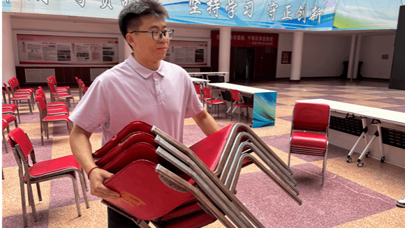 基础服务传递青春温度。清晨的校园里,身着统一标识的志愿者已就位。从校门口引导至赛场入口,他们以清晰指引疏解人流,用耐心解答回应咨询,单日服务参赛人员及观众超 500 人次,成为展现高校学子风貌的“文明窗口”。后勤保障岗位上,志愿者们高效完成 200 余箱物资转运、多个赛场补给巡查,及时响应参赛人员需求,用细致服务传递温度。
