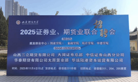 11月4日下午,在就业创业中心(创业学院)指导下,金融学院联合统计学院、中德学院共同举办了2025证券业、期货业联合招聘会。山西三立期货有限公司、大同证券总部、中信证券山西分公司、华泰期货有限公司太原营业部、华远陆港资本运营有限公司5家业内优质企业齐聚现场。就业创业中心(创业学院)、金融学院、统计学院、中德学院及200余名毕业生参加招聘会。