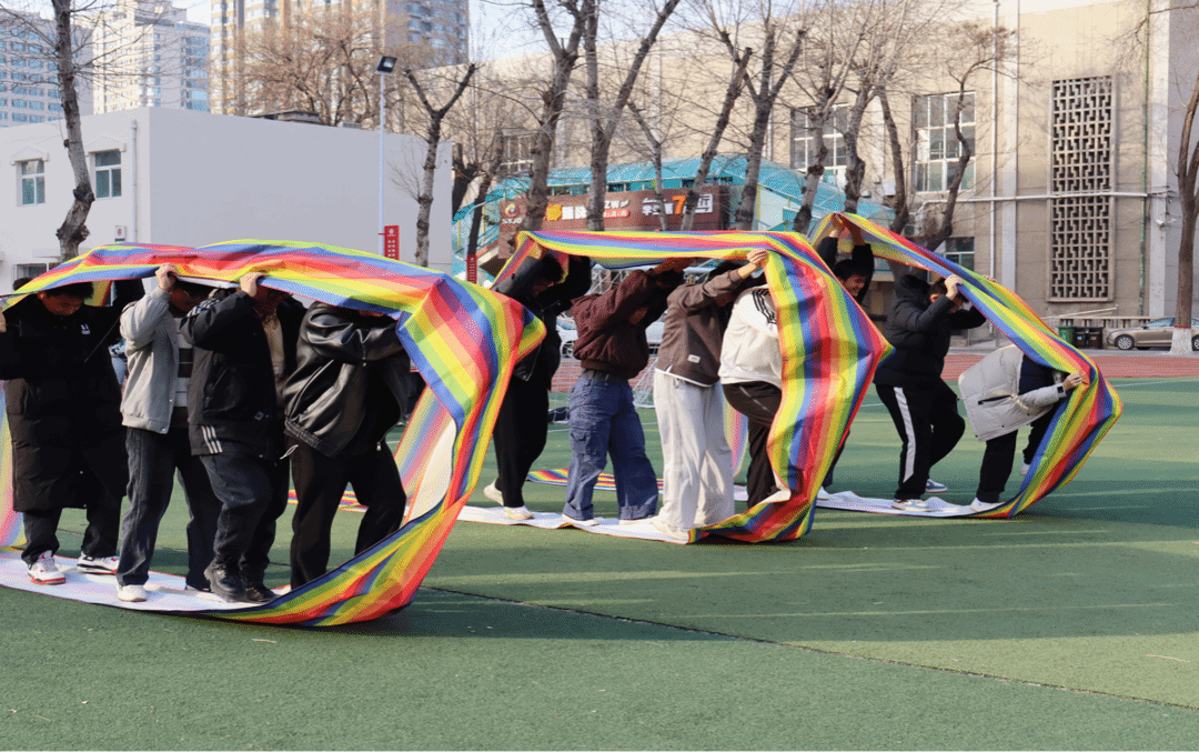 最引人注目的当属“车轮滚滚”项目。巨大的彩色履带将整个团队“包裹”在一起,大家既是独立的个体,又是命运共同体。随着一声哨响,履带在大家的同步发力下,像一条斑斓的巨龙在操场上蜿蜒前行。步调不一便寸步难行,唯有心往一处想、劲往一处使,才能冲向终点。这一刻,友谊的纽带在无形中被拉得更紧。