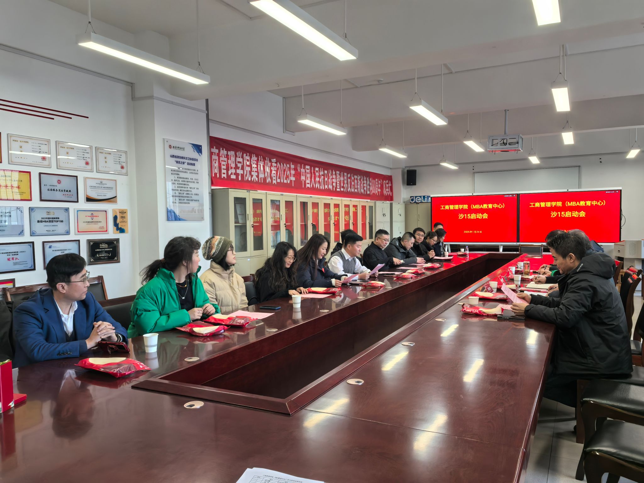 1月24日上午,以“凝心聚力战沙15,财大荣光共铸就”为主题的山西财经大学MBA沙15战队筹备启动会在工商管理学院会议室举行。会议采用线上线下同步直播的方式进行,由2018级MBA校友徐强主持。学院党委书记李群生、副书记周志刚、副院长薛继东、工商管理学院校友会会长郭海明、校友代表丰开庆、沙赛组委会代表宋煜以及全体沙15预备队员参加动员会。会议旨在统一战队思想、明确赛事规则、拆解筹备任务、凝聚团队共识,为沙15征程奠定坚实的组织与思想基础。