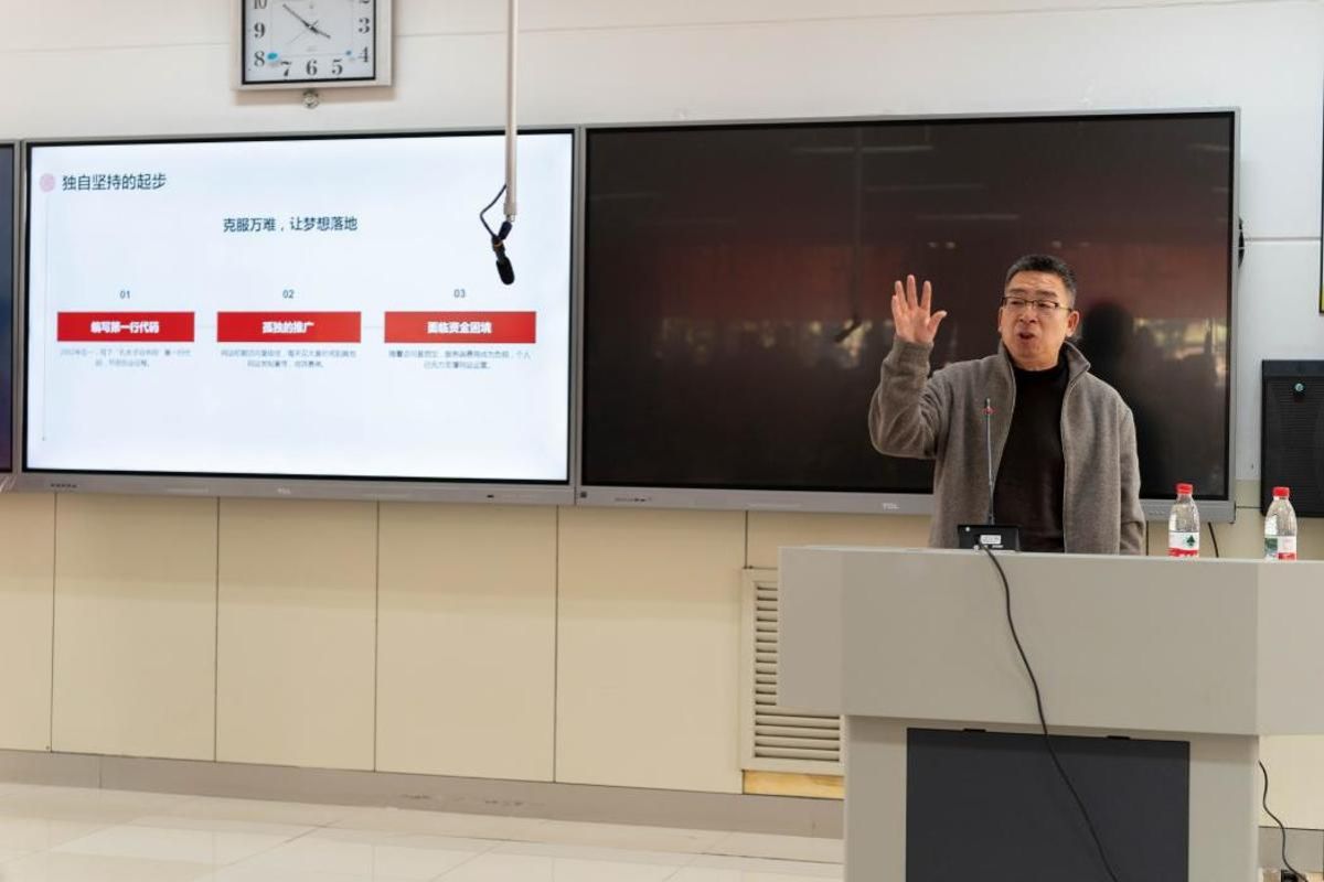 孙雨田校友毕业后怀揣青春梦想北上,成为一名“北漂”程序员,在代码的世界里潜心磨砺技艺、积累实践经验。2002年创办孔夫子旧书网,如今该平台已成长为国内规模最大、影响力最广的旧书交易平台,2015年,他又携手同仁创办国内最大的民间图书馆——杂书馆,用实际行动守护文化遗产、传承中华文脉。在报告中,他用真挚的语言、生动的实践,将自己的奋斗历程缓缓道来,为大家完整呈现了自己的成长与创业之路:从“迷茫的大学四年”到“艰难的北漂岁月”,从“平淡中的孕育”到“孔网的诞生”,从“回乡再创业”到“孔网走上正轨”,再到主动拥抱“AI时代的机遇”。他坦言,创业之路并非一帆风顺,其间充满了迷茫与挫折、坚守与付出,作为山财学子,要始终将专业所长与时代需求紧密结合,在坚守初心中挖掘价值,在不懈奋斗中实现成长。
