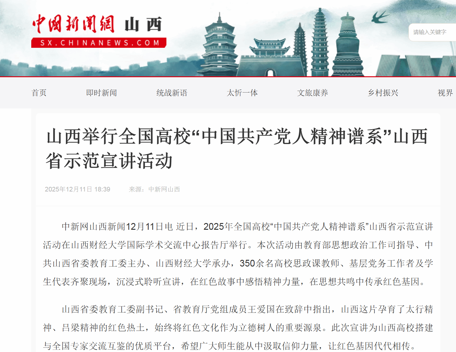 中新网山西新闻12月11日电 近日,2025年全国高校“中国共产党人精神谱系”山西省示范宣讲活动在山西财经大学国际学术交流中心报告厅举行。本次活动由教育部思想政治工作司指导、中共山西省委教育工委主办、山西财经大学承办,350余名高校思政课教师、基层党务工作者及学生代表齐聚现场,沉浸式聆听宣讲,在红色故事中感悟精神力量,在思想共鸣中传承红色基因。