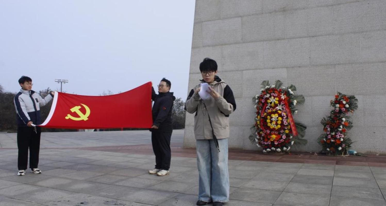 随后,全体人员在百团大战纪念碑广场举行了缅怀先烈仪式。在庄严肃穆的氛围中,肃立默哀30秒,以表达对革命先烈的深切缅怀。学生代表项鹏宇同学发言,坚定表达了继承先辈遗志、坚守理想信念的决心。教师代表向纪念碑敬献花篮,表达对英烈的深切哀思与崇高敬意。全体党员同志重温入党誓词,铿锵誓言在纪念碑前激扬回荡。